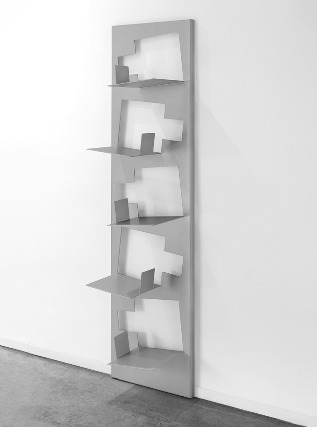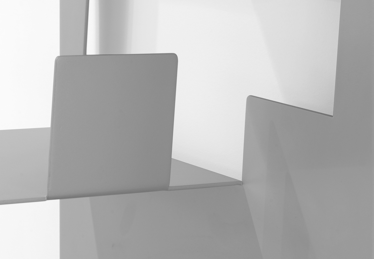 Pop-Up es una librería vertical realizada con plancha de acero termolacada. Está realizada mediante un proceso de mecanización a base de corte y plegado inspirado en la papiroflexia, en el que a a partir de una plancha rectangular obtenemos esta librería. Este proceso conforma tanto la forma de los estantes como los pliegues laterales verticales que rigidizan la librería. Los estantes disponen de una solapa lateral y presentan una leve inclinación hacia ella, lo que permite que los libros se mantengan verticalmente en equilibrio sin necesidad de elementos ajenos añadidos. En su parte trasera presenta una pestaña oculta que permite una fijación mural de seguridad.